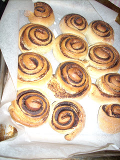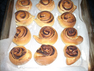 Ezután bejgliszerűen feltekerjük a tésztát, szeletekre vágjuk (nem tudok centit mondani, én érzésre szoktam vágni, ahogy esik, úgy puffan) és sütőpapírral bélelt tepsire sorakoztatjuk a csigákat, ahol újabb 30 percig pihiznek.