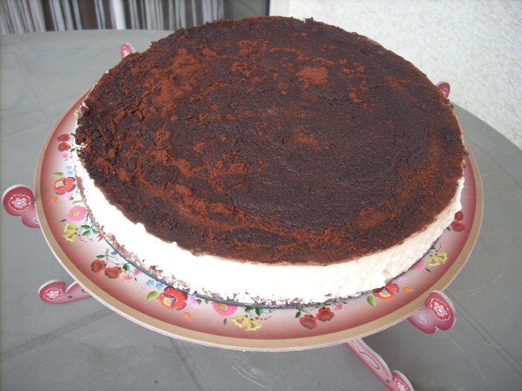 A kihűlt piskótát kivesszük a tortaformából, lehúzzuk róla a sütőpapírt, a tortaformát elmossuk és szárazra töröljük, majd visszatesszük bele a piskótát. A sziruphoz a cukrot és a vizet összemelegítjük a mikróban, hogy a cukor feloldódjon, majd kiskanállal meglocsoljuk vele a piskótát (nem kell az összes szirup, mert akkor elázik a piskóta, elég néhány kiskanál). Ezután a piskótán elsimítjuk a túrókrémet, teaszűrőn át vastagon megszórjuk cukrozatlan kakaóporral, majd 1 éjszakára elküldjük hűsölni a hűtőbe.