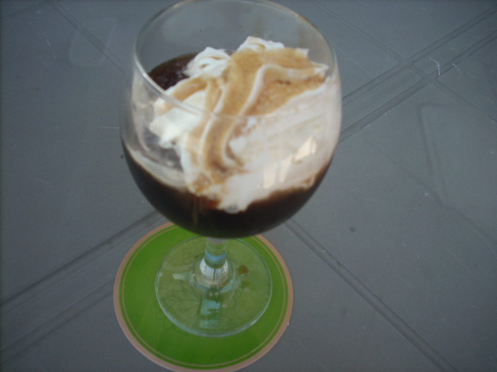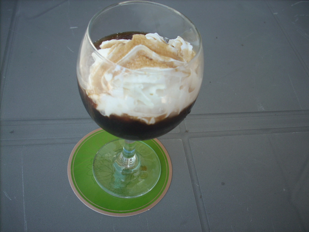 A hozzávalókat keverjük össze, majd tegyük mélyhűtőbe másfél órára, ha letelt az idő, egy spatulával keverjük meg, majd tegyük vissza újabb egy órára, ha szemcsésre fagyott, szedjük talpas pohárba, halmozzunk rá tejszínhabot, a habra csorgassunk egy kis kávélikőrt. Isteni finom! Én ki fogom próbálni citromos változatban is!
