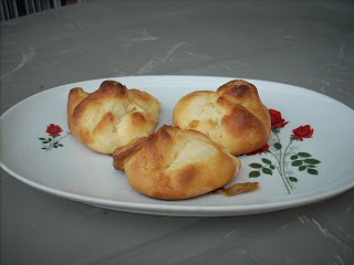 A megkelt tésztát 4 felé vesszük, mindegyiket egyenként kinyújtjuk, 6 részre osztjuk, a négyzetek közepébe egy kanál tölteléket teszünk. És akkor jön a batyuzás: a tészta négy sarkát összefogjuk, összecsippentjük. Remélem, más több sikerrel hatja végre a műveletet, mint én.