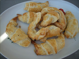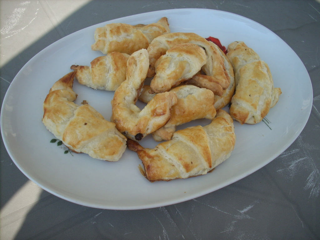 És mi legyen szegény kis leveles tésztával? Legyen belőle croissant! És mivel rólunk van szó, legyen csokis croissant! A recept rém egyszerű: leveles tésztát kibont, háromszögekre vág, a háromszögekbe egy-egy kocka étcsokit tesz, kifliszerűen felgöngyöl (na, ezt nekem még gyakorolni kell, elég érdekes formációkat hoztam össze, de fog ez menni!), sütőpapírral bélelt tepsire rátesz, felvert tojással leken, 180 fokra előmelegített sütőbe kb. 15-20 perce betesz.