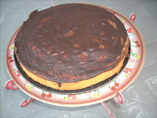 Elkészítjük a csokimázt: a hozzávalókat összeolvasztjuk egy kis edényben, majd ráöntjük a piskótára.