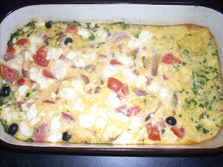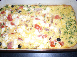 Előmelegítjük a sütőt. Felverjük a tojásokat egy tálban a petrezselyemmel együtt. Nagy serpenyőben felforrósítjuk az olajat, beletesszük a hagymacikkeket. 4 percig nagy lángon sütjük, amíg a széle barnulni nem kezd. Adjuk hozzá a paradicsomot, az olajbogyót és süssük további 2 percig. Vegyük kisebbre a lángot és öntsük a serpenyőbe a felvert tojást. Süssük kb. 2 percig, amíg elkezd szilárdulni, majd morzsoljuk rá a feta sajtot.