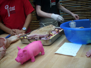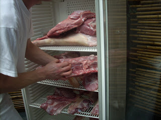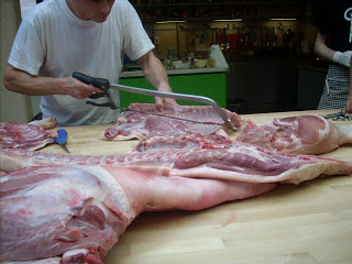 Megismerkedtünk a nagyon szimpatikus hentesünkkel, aki részletesen elmagyarázta a disznó felépítését (végre megtudtam, mi az a felsál!), miközben akkurátusan feldarabolta a husit: