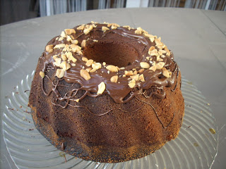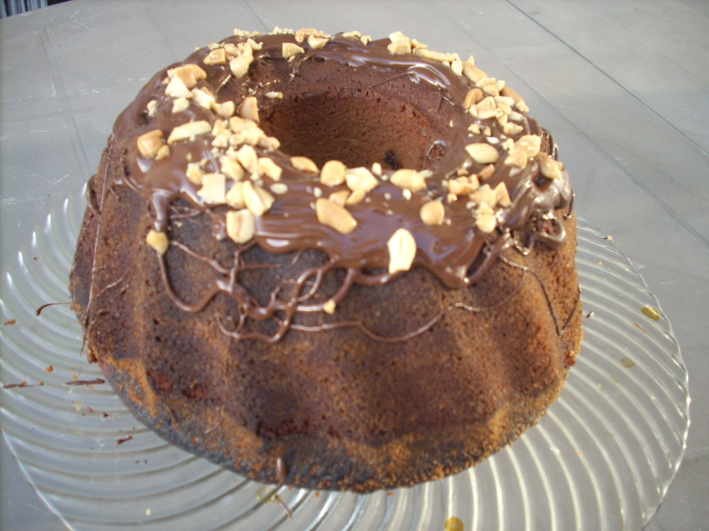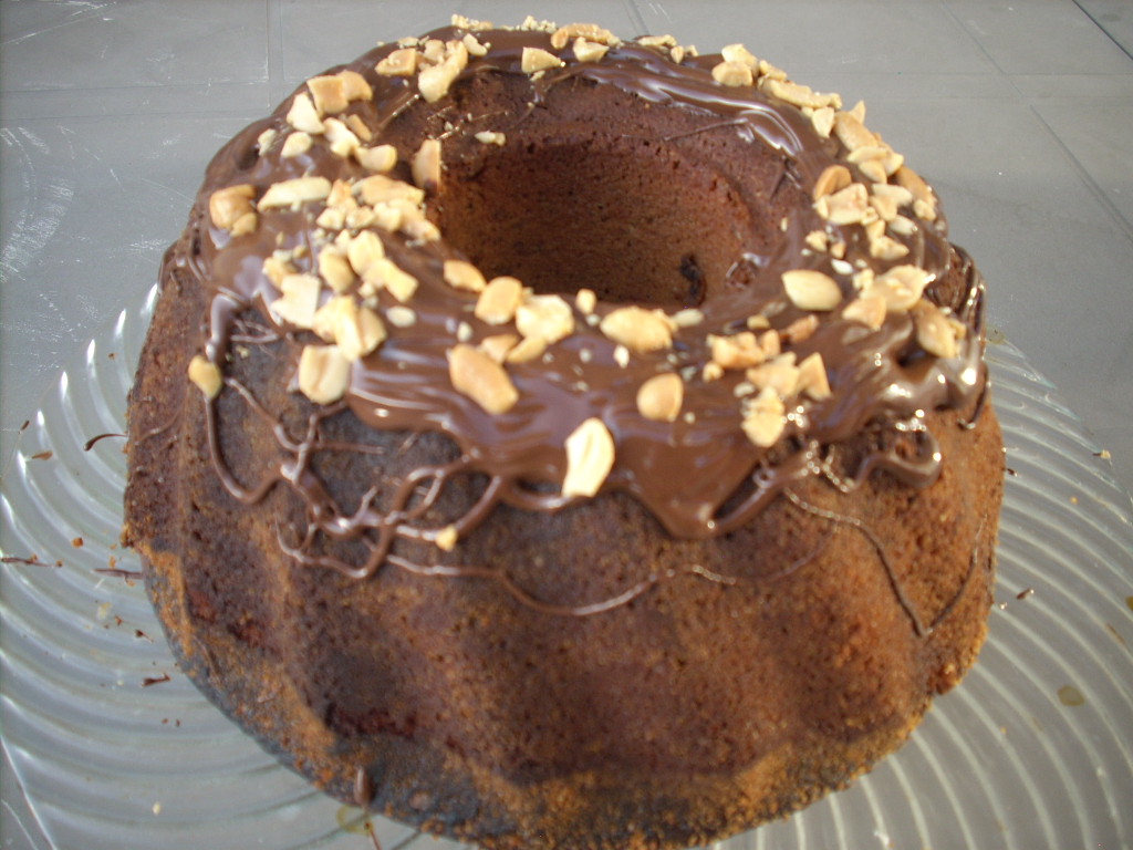 Ha kész a kuglóf, kiborítjuk egy tálcára, csokit olvasztunk a tetejére, vágott mogyoróval megszórjuk.