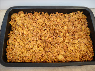 Egy serpenyőben összeolvasztjuk a vajat, a juharszirupot (mézet) és a cukrot. Levesszük a tűzről, hozzáadjuk a zabpelyhet, a fahéjat, a kókuszreszeléket, a magokat és a mogyorót. Az egészet összekeverjük (nagyon gusztustalan lesz a cucc, de hát valamit valamiért, ugyebár), beleöntjük a tepsibe, és kb. fél óra alatt készre sütjük.