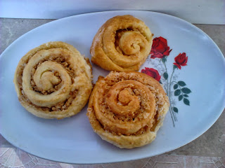 Eredetileg kalácsot akartam sütni reggelire. Aztán a Vidék Íze című újságot lapozgatva természetesen megláttam egy ínycsiklandozó fényképet, és gyorsan változtattam a terven. Én már csak ilyen vagyok. Egy hétre előre eldöntöm, hogy mit szándékozom sütni/főzni, aztán az utolsó pillanatban elcsábulok valami másra. Eredetileg egészséges változatban szerettem volna megsütni a csigákat, de persze megtámadtak a molyok, és az összes (irtó drága) teljes kiőrlésű lisztemet ki kellett dobnom. Már nem volt kedvem elmenni a bioboltba, ezért maradt a sima liszt. Így is nagyon finom lett.