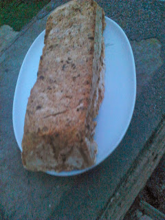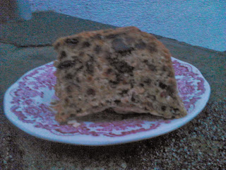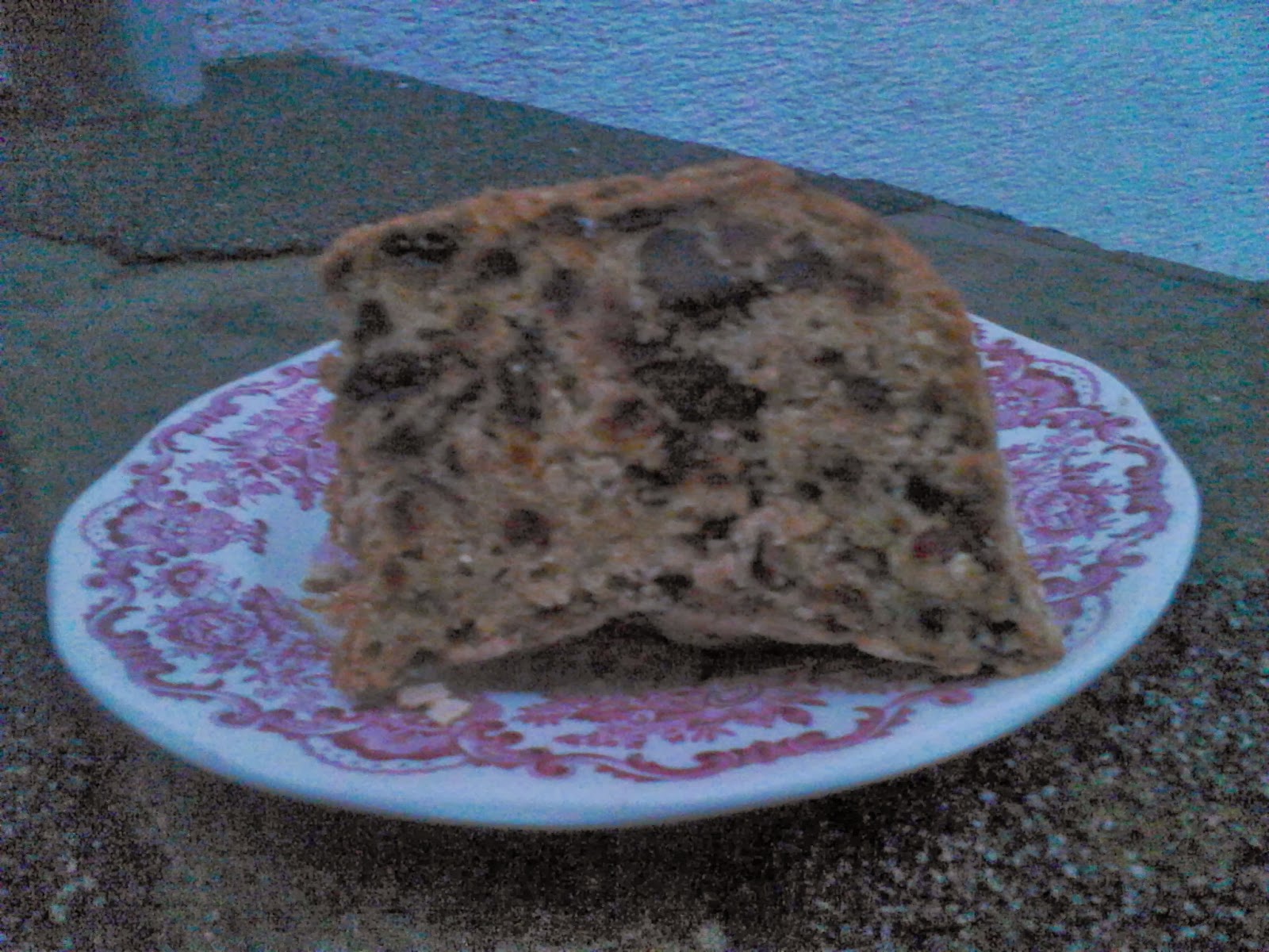 A kutyus nagyon kikapott ezért a sütiért. Az történt, hogy már megint komoly problémáim támadtak a túlburjánzó tojásfehérjékkel, nevezetesen nem tudtam becsukni a mélyhűtőt, ki kellett szednem néhány lefagyasztott zacskót, és gyorsan ki kellett találnom, mire használom fel őket. Csak valami minimál sütésre gondoltam, ezért elég gyorsan kikötöttem a püspökkenyérnél. Már csak azért is, mert a mazsola és az aszalt áfonya lejárati határideje is erősen közeledett. Gyorsan körülnéztem a receptes újságjaim között (katasztrófa, egy teljes szekrény tele van velük, és már nincs benne a hely, mert az újságok csak jönnek és jönnek..), és a Vidék ízében gyorsan rá is leltem egy egyszerű, de nagyszerű receptre. Percek alatt elkészült a tészta, ment a sütőbe, meg is sült. Amikor kihűlt, tányérra borítottam, hogy viszem lefotózni, aztán elmentem a mosógéphez, mert lejárt a program. És a kutyus a konyhában maradt..Mire visszaértem, a süti már darabokban hevert a konyha kellős közepén, őkicsisége pedig elégedetten hamizta a zsákmányt. Nem kicsit borult el az agyam, nagyot csaptam a nózijára, le is kiabáltam a kis fejecskéjét rendesen, és azonnali hatállyal kipateroltam a házból. Néhány percen belül magamhoz tértem, jót nevettem, kutyusnak látványosan megbocsátottam, a sütit másnap újra sütöttem. Happy end a köbön. És még finom is volt a gyümikenyér!