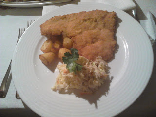 Majd egy szép adag rántott hús érkezett, ami abban a különbözik a nálunk megszokottól, hogy a panírban nincs külön ízesítés. Természetesen ez is elfogyott.