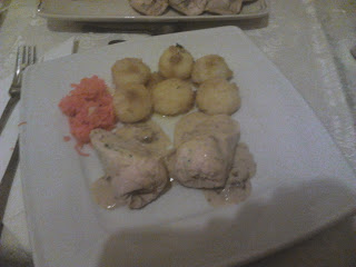 Omlós kijevi csirkét kaptunk krumpligombóccal és gombás mártással és egy fenséges répás valamivel: