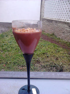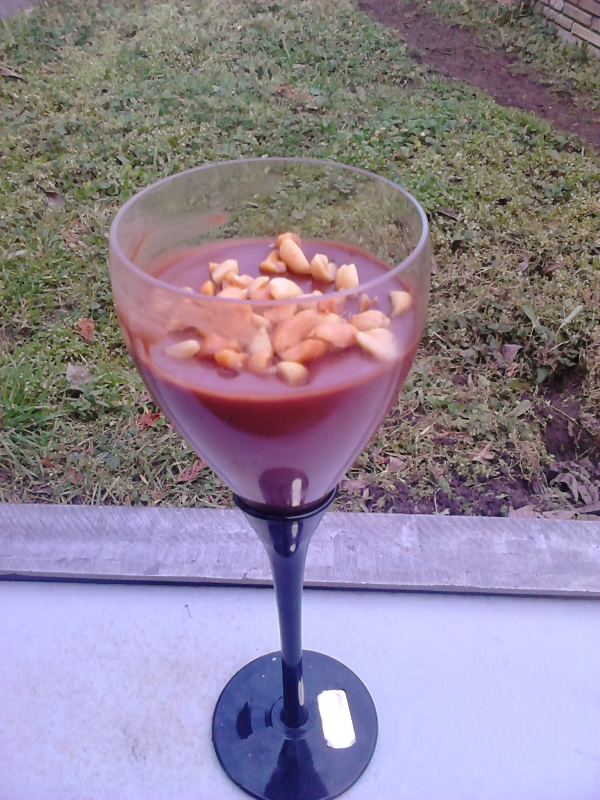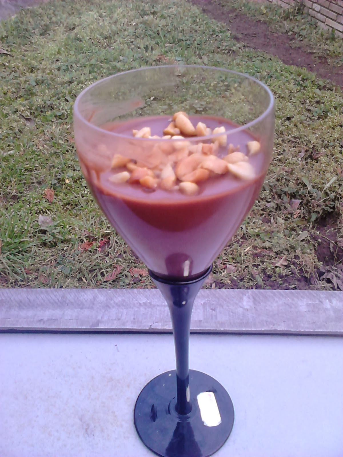 Poharakat vagy tálkákat kerítünk, belemérjük a krémet, a tetejét megszórjuk durvára vágott mogyoróval (pisztáciával, kókuszreszelékkel, dióval, kinek mi tetszik), majd egy éjszakára a hűtőbe tesszük a finomságot, és másnap gátlások nélkül behabzsoljuk az egészet. Vigyázat, függőséget okoz!
