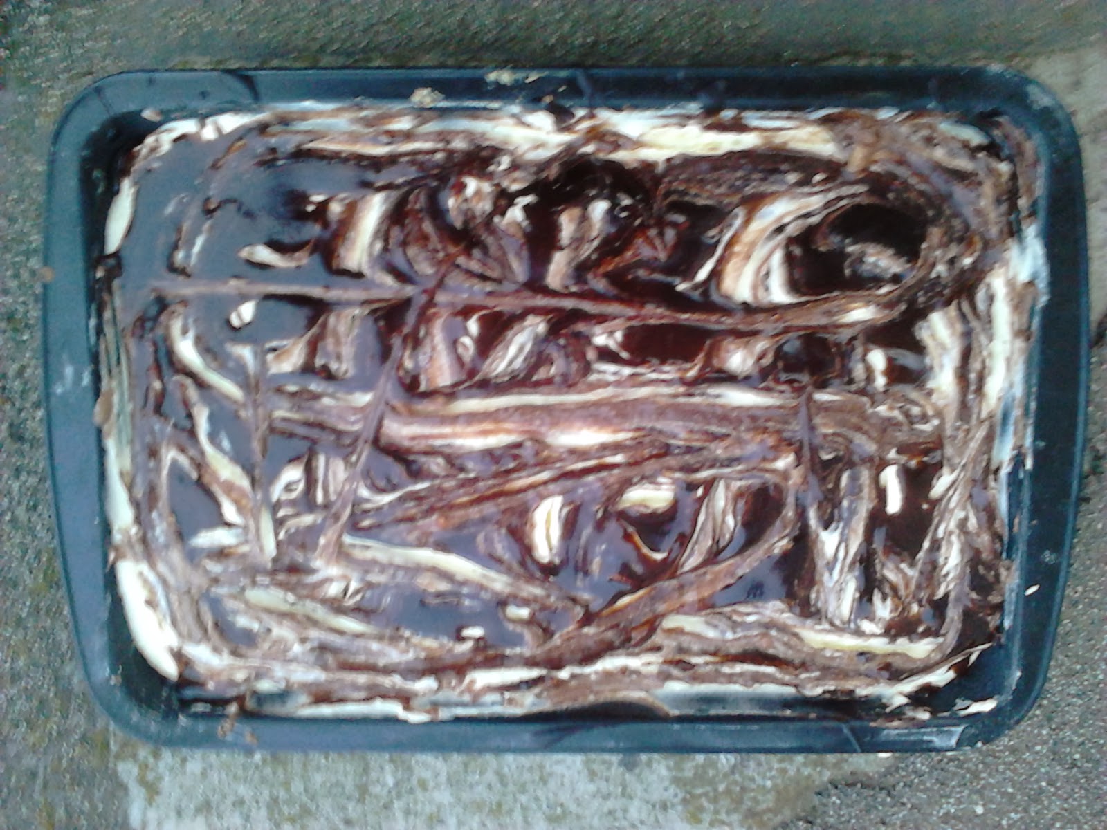 A mázhoz a hozzávalókat egy kisebb lábosban összemelegítjük, és kicsit hagyjuk hűlni. Meglocsoljuk vele a krémet, majd villával hullámosan belekeverjük.