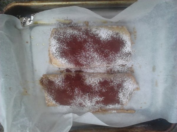A réteslapot két részre osztjuk. A lapokat egyenként megkenjük olvasztott vajjal. A legfelsőre rátesszük a csokis-mogyorós elegy felét, aztán a körte és az aszalt áfonya felét, majd megszórjuk az étcsoki felével. A két szélét ráhatjuk, majd nem túl szorosan feltekerjük, és sütőpapírral kibélelt tepsibe tesszük. Ugyanígy járunk el a réteslap másik felével. A két rúd tetejét megkenjük a felvert tojással, és már mehet is a sütőbe, ahol kb. fél óra alatt készre sütjük (tűpróba!). Ha langyosra hűlt, megszórjuk előbb porcukorral, aztán kakaóporral. Szeleteljük, és habzsoljuk, amíg tart!
