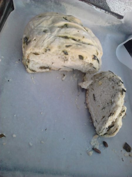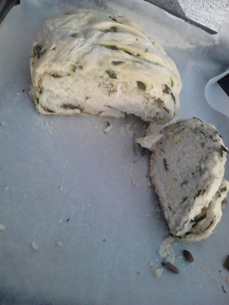 Vesztemre belelapoztam a Nők Lapjába és megláttam a medvehagymás kenyér receptjét. Időhiány miatt nem álltam neki megsütni, el is pakoltam az újságot, talán ki is marad az életemből, ha nem találkozom a bazsalikomos retekkompót fotójával, ahol egy kenyéren tálalták a finomságot. Erre azonnal beugrott, hogy 1. van lefagyasztva medvehagyma 2. valahol láttam egy medvehagymás kenyér receptet. Lövésem sem volt, hol láttam, végigtúrtam egy csomó receptes újságot, és semmi. Aztán amint beléptem a szobámba, az ágyam melletti kis asztalon megláttam a Nők Lapját, és a kérdés azonnal megoldódott, már álltam is neki a sütésnek. Nem vagyok túl gyakorlott kenyérsütésben, ezért kicsit korán vettem ki a sütőből, kihűlés és kóstolás után vissza kellett még kapcsolni a sütőt, mert egy kicsit még nyers volt, de annyi baj legyen, nagyon finom reggeli lett belőle!