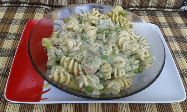 Egy nagyobb lábosban olívaolajon üvegesre pároljuk a hagymát, hozzáadjuk a kockázott füstölt húst, enyhén megpirítjuk. A brokkolit hozzáadjuk a húshoz, sózzuk, borsozzuk. Mehet hozzá a borsó, az aprított (szárított) bazsalikom, a zúzott fokhagyma, majd felöntjük a húslevessel. 5 percig forraljuk, hozzáadjuk a tésztát, addig főzzük, amíg a tészta megpuhul, beleöntjük a tejszínt, egyet forralunk rajta, és már készen is van.