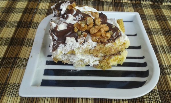 És már csak az összeállítás van hátra. A piskótát kis kockákravágjuk. Egy üvegtálba teszünk a felét, meglocsoljuk a rum felével, mehet rá a krém és a tejszín fele, kevés csokiöntet. Ezután következik a piskóta másik fele, rálöttyintjük a rum másik felét, a krém és a tejszín másik fele következik, majd meglocsoljuk a csokiöntettel. Megszórjuk a durvára vágott dióval, egy éjszakára mehet a hűtőbe, másnap szeleteljük és habzsoljuk. Nagyon durván finom!