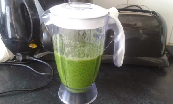 A spenót is beletesszük, a vízzel 1 literre kiegészítve simára turmixoljuk.