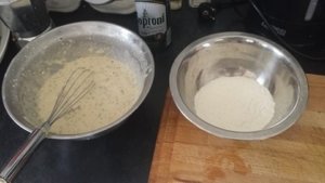 Amíg a paradicsomok békésen sülögetnek, elkezdünk foglalkozni a csirkével. Kisebb darabokra vágjuk a húst, besózzuk, egy kisebb tálba lisztet készítünk elő, egy másikban pedig összekeverjük a 30 dkg lisztet a tojásokkal, az apróra vágott petrezselyemmel, a sóval, a borssal és a sörrel. És miközben olajat hevítünk egy serpenyőben, buzgón nekiállunk panírozni: a csirkedarabokat megforgatjuk először sima lisztben, majd a sörös elegyben, és szép sorban kisütjük őkelméket.