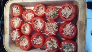 A paradicsomokat megmossuk, levágjuk a tetejüket, félretesszük őket, a paradicsomok alját egy tepsibe sorakoztatjuk: