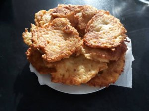 Együnk berét! Általában elég jó beszélőkével rendelkezem és a szókincsem sem a Mariana-árok alján szokott szomorkodni, de erre a kérdésre a reggeli torna után nem kicsit csapzottan hazaérve csak ennyit tudtam kipréselni magamból: “Mit?” Hát berét! Némi internetes kutakodás, valamint a győri és tatabányai ételnevek közötti eltérések tisztázása után kiderült, hogy apukám barátnője arra gondolt, hogy a már tegnap elkészült borsóleves mellé süthetnénk egy adag tócsnit. Nem tiltakoztam túlságosan, és mivel még soha nem készült a konyhámban ilyen (édesszájú a család, miért sütnék sós finomságot, nemdebár?), belevágtunk a projektbe, jelentem teljes sikerrel, a végeredmény olyan fincsi lett, hogy már csak mutatóban akad néhány darab a szerencsére időben lefotózott tócsnihegyből. Egy egyszerű, de nagyszerű nasi, amely a maga hétköznapiságában magasabb dimenzióba emelte a szombati ebédet, jó ötlet sohasem rossz, nem igaz?
