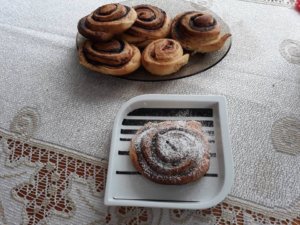 A megkelt tésztát lisztezett felületen kinyújtjuk, megkenjük az 5 dkg olvasztott vajjal, eloszlatjuk rajta egyenletesen a cukrozott kakaót (én azt mondom, minél több, annál jobb, de mindenki az ízlése szerint válassza meg a mennyiséget), bejgliszerűen feltekerjük, szeleteljük. A csiguszokat sütőpapírral bélelt tepsibe sorakoztatjuk, megkenjük a 2 dkg olvasztott vajjal, és 20 percig kelesztjük. Ezután betoljuk őkelméket a 180 fokra előmelegített sütőbe, kb. 10 perc után megkenjük őket a vaníliás cukros tejjel, majd készre sütjük (tűpróba!). És ennyi, készen vagyunk, hatalmas önmérsékletről tanúságot téve megvárjuk, amíg langyosra hűlnek, és már indulhat is a habzsi-dőzsi. Hétköznapi gasztrocsoda.