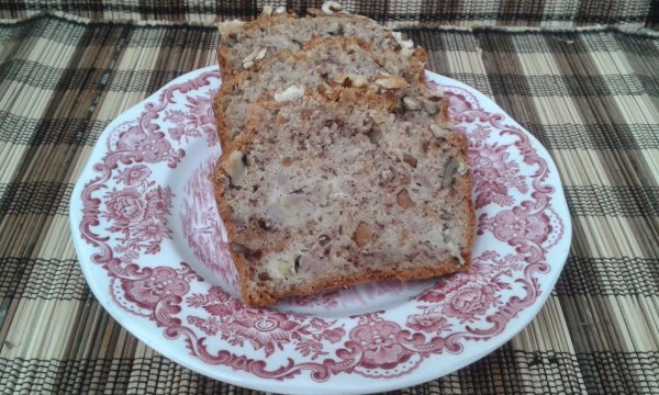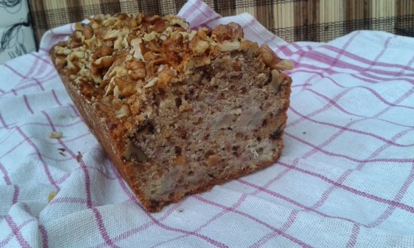 A tésztát sütőpapírral bélelt vagy kivajazott-kilisztezett püspökkenyérformába mérjük, a tetejét megszórjuk a maradék 5 dkg durvára vágott dióval. 180 fokra előmelegített sütőbe toljuk, és kb. 40 perc alatt készre sütjük (tűpróba!).