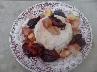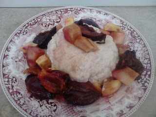 Egy tányérra tejbegrízt szedünk, ráhalmozzuk a sült gyümit, minek olyan illata van, hogy képtelenség ellenállni neki (nem mintha bármi ilyen szándékunk lenne…,), és már eshetünk is neki a finomságnak.