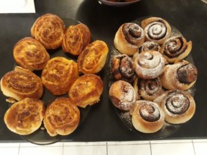 Egy nagy tálba tesszük a lisztet (elvileg szitálni kellene, de eleget súlyzóztam a reggeli edzésen, úgyhogy kihagytam), elkeverjük a sóval és a cukorral. Mehet bele a tojás és a tojássárgája, az olvasztott vaj és az élesztős tej. Ruhaujjat felgyűr, tésztát bedagaszt. Tiszta konyharuha, 45 perc pihi.