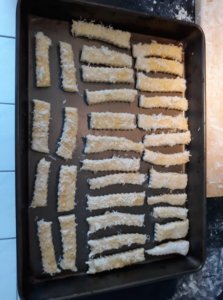 Lisztezett felületen ujjnyi vastagra kinyújtjuk, lekenjük tojással, megszórjuk sajttal, derelyevágót ragadunk és jól felcsíkozzuk őkelmét. És ennyi, készen is vagyunk, a rudakat sütőpapírra sorakoztatjuk, mehetnek a 180 fokra előmelegített sütőbe, ahol kb. 15 perc alatt készre sütjük őket. Nagy nehezen megvárjuk, amíg langyosra hűlnek, aztán jól ledöbbennünk azon, hogy milyen gyorsan elpárolognak….